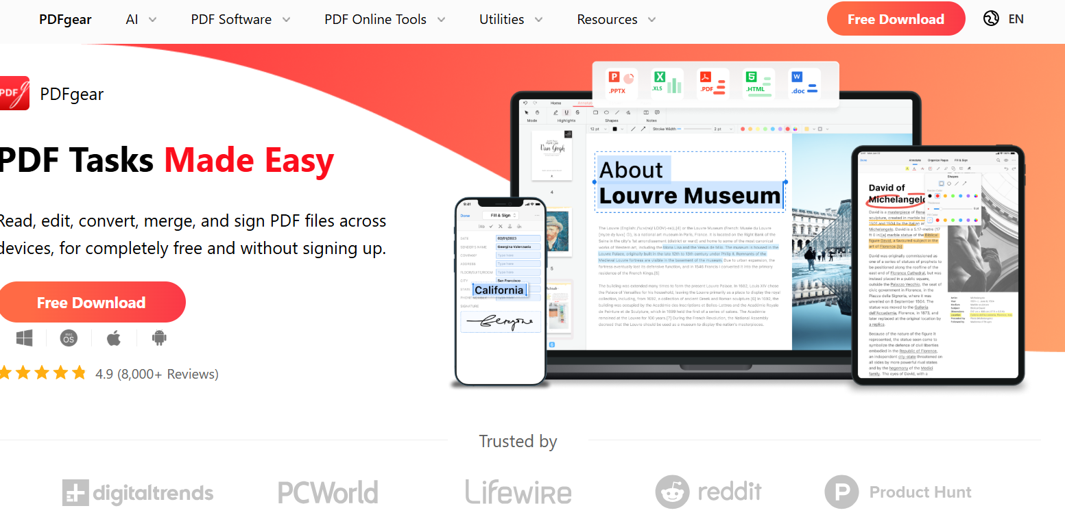 **Pricing varies widely, with completely free options like PDFgear and subscription plans starting around $7.99/month for more advanced features.